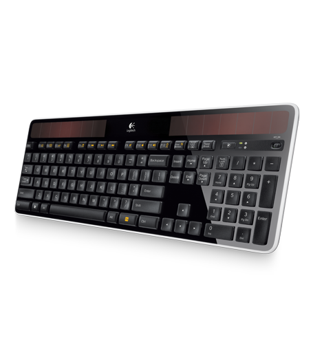 The Logitech wireless solar keyboard K750 (PC version) is very thin with two amorphous silicon solar panels.